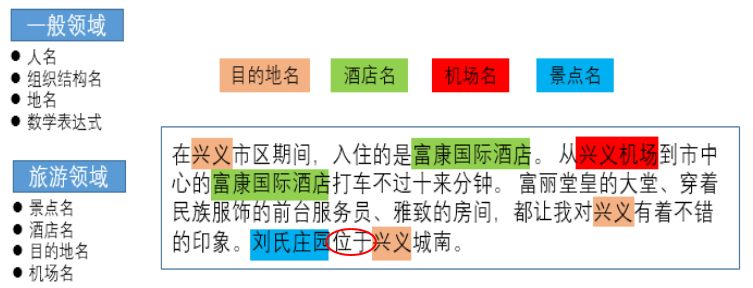 如下图所示,我们可以抽取出刘氏庄园这个景点名,同时可以抽取出兴义这个目的地名,也可以挖掘出它们之间的“位于”关系。那么这段文本中的“刘氏庄园”->[位于]->“兴义”这条知识图谱数据就成功被抽取出来了。