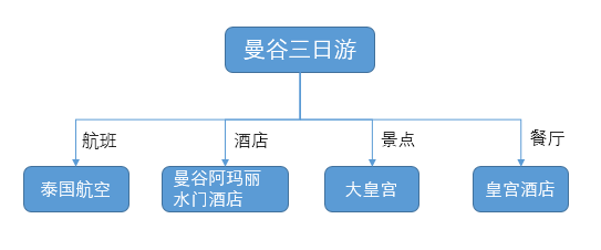 如上图所示,曼谷三日游是一个旅游产品,它包含泰国航空、曼谷阿玛丽水门酒店、大皇宫、皇宫酒店等子产品,每个子产品都有自己不同的数据属性和架构。