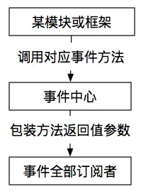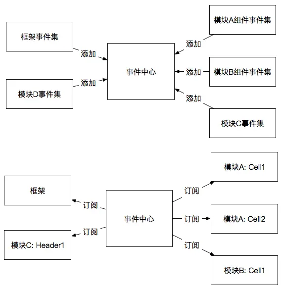 考虑到模块间通讯可以1对多, 而前面两种皆为1对1通讯, 所以我们选择基于ReactiveCocoa或RxJava库, 遵循观察者模式来实现一个囊括所有跨模块事件的共享对象, 以进行集中式管理. 以下称之为 事件中心.