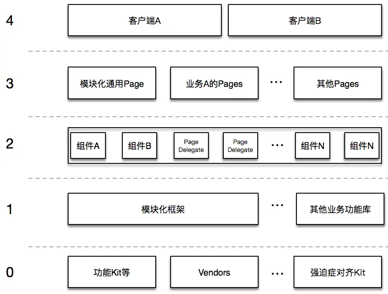 | 1 | 业务功能层(内塔) | 依旧与业务相关的一层. 但属于公共的业务功能 | 模块化定义的接口, 遵循接口的VC基类、"组件"基类, ClassMapper, EventCenter, 其他辅助组件开发的类等 |