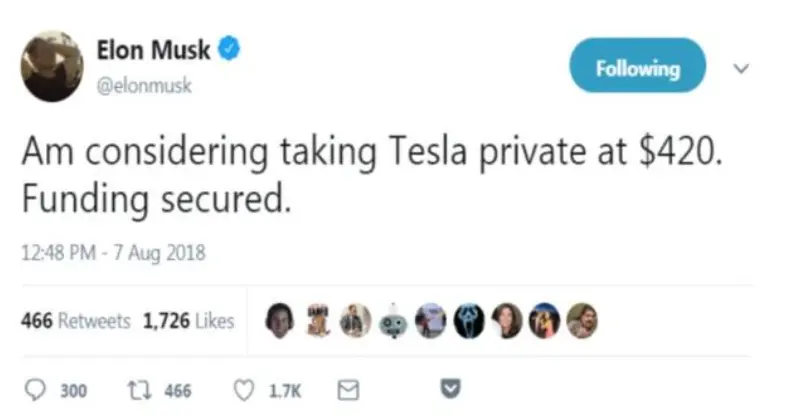 马斯克将特斯拉私有化的推文也没有得到特斯拉董事会或股东们的热烈欢迎,这也是美国证券交易委员会调查的原因。
