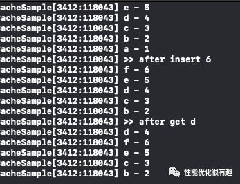 LRUCache<string, int> cache(5); cache.insert("a",1); cache.insert("b",2); cache.insert("c",3); cache.insert("d",4); cache.insert("e",5); cache.forEach([](string& key,int& value){ NSLog(@"%s - %d",key.c_str(),value); }); NSLog(@">> after insert 6"); cache.insert("f",6); cache.forEach([](string& key,int& value){ NSLog(@"%s - %d",key.c_str(),value); }); NSLog(@">> after get d"); cache.get("d"); cache.forEach([](string& key,int& value){ NSLog(@"%s - %d",key.c_str(),value); });