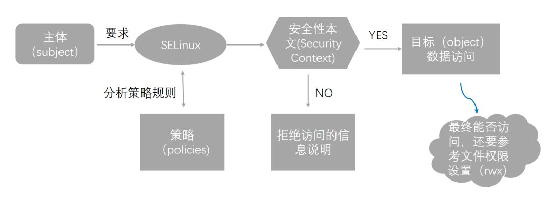 Enforcing 模式:将受限主体进入规则比对、安全本文比对,如果失败,抵挡主体程序的读写行为,并且记录这一行为。 如果成功,这才进入到 rwx 权限的判断。