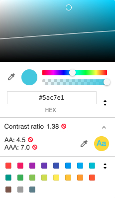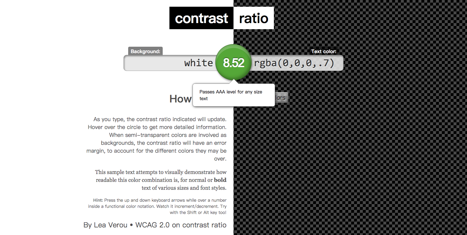 两侧分别为文本颜色与背景色,中间一个醒目的圆盘,显示二者的对比度,鼠标移动到这个圆盘上可以查看该对比度符合 AA/AAA 对比度标准。