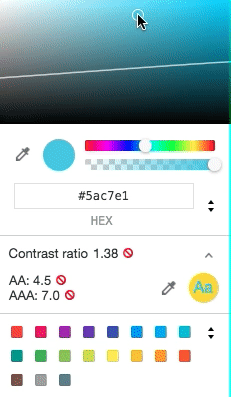 然后点击调色板的 Contrast radio 选项,展开对比度计算工具,可以看到上方的调色板出现一条白线,这条白线就是符合 AA 级对比度标准的临界值。调色板中的圆圈就是当前选中的色值,拖动这个色值即可调整文本颜色,这时下方的对比度计算工具进行了实时计算: