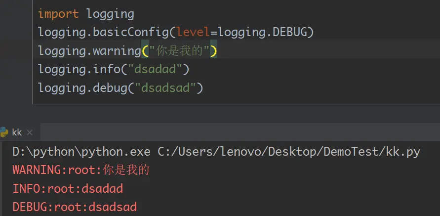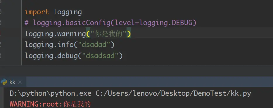 Python 中日志的默认等级是 WARNING,DEBUG 和 INFO 级别的日志将不会得到显示,在 logging 中更改设置