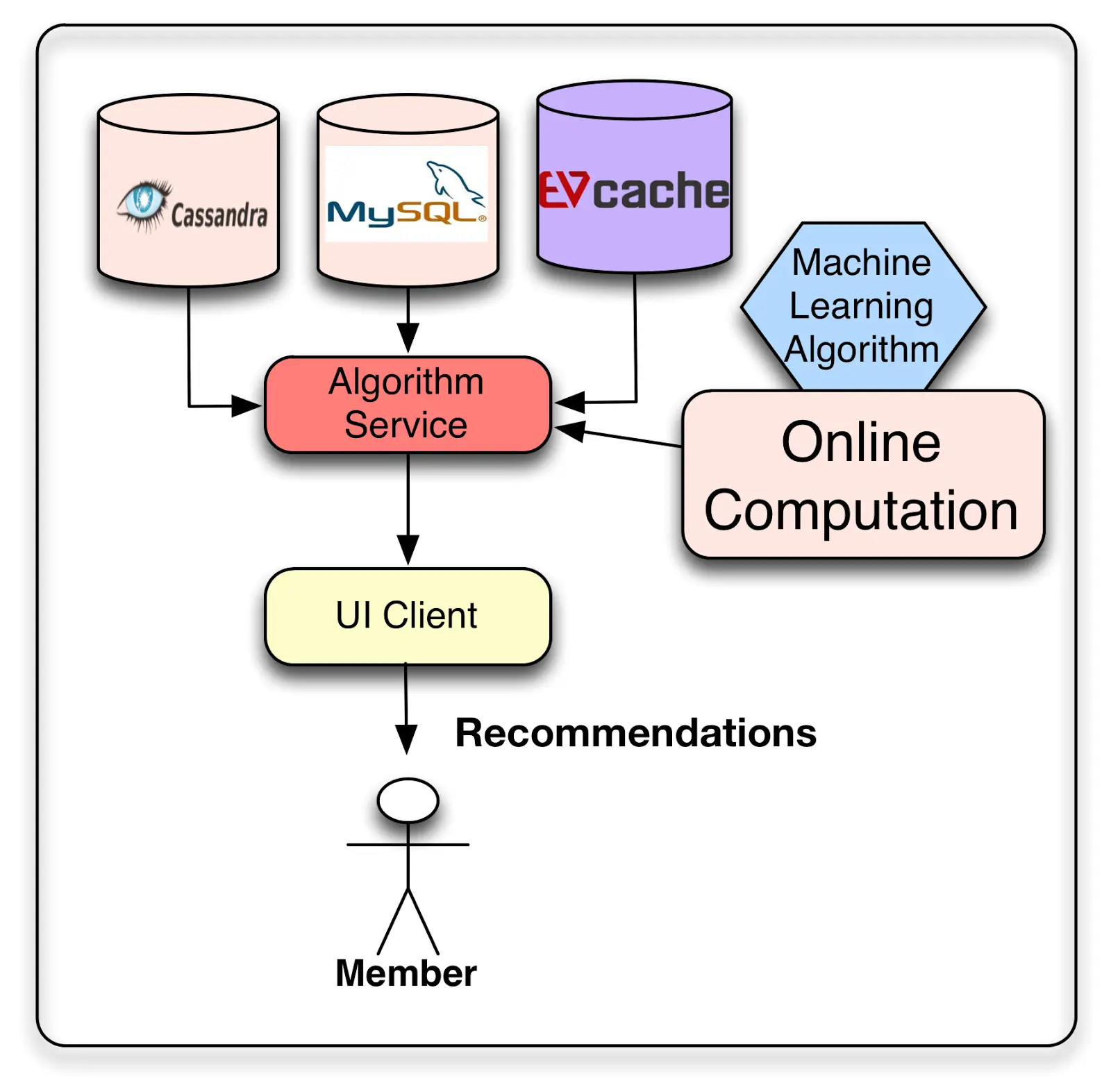 Online计算可以快速响应事件并使用最新数据。 一个示例是使用当前context为action movie gallery排序。 联机组件受可用性和响应时间服务级别协议(SLA)的约束,该协议指定响应来自客户端应用程序的请求的进程的最大延迟。 这使得在复杂且计算成本高的算法难以在online service中使用。 此外,纯粹的在线计算在某些情况下可能无法满足其SLA,因此考虑快速回退机制(例如恢复到预先计算的结果)很重要。 online计算还意味着所涉及的各种数据源也需要在线提供,这可能需要额外的基础设施。