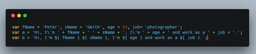 模板字面量比以前更容易处理字符串。以'开头,并且可以使用${variable}插入变量。比较这两行代码: