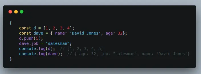 const不会使变量成为不可变的,只是锁定其赋值。如果您具有复杂的赋值(对象或数组),则仍可以修改该值。