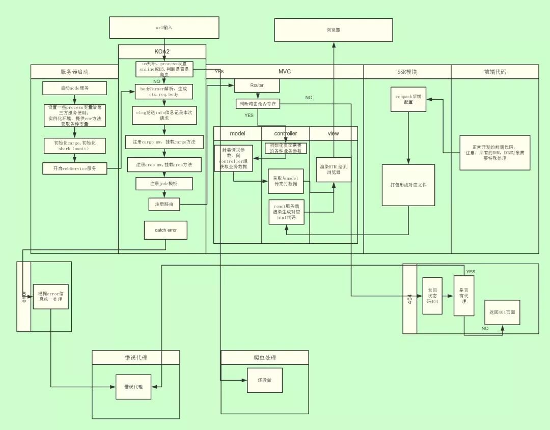 大致可以分为从服务启动注册、用户访问流程管控、React服务端渲染HTML三大模块。 很显然,哪怕在Node层也不会去做运算逻辑。除了监控日志外,就是做好服务端渲染。这里每一步流程,就不一一展开了。
