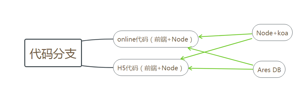 采用4git仓库,分别存放Online、H5独有代码,Ares DB存放前端共用业务组件和框架组件,Node+Koa存放共用Node框架。这样好处在于通过npm包的方式共享代码,让业务和框架代码分离,职责更加明确。