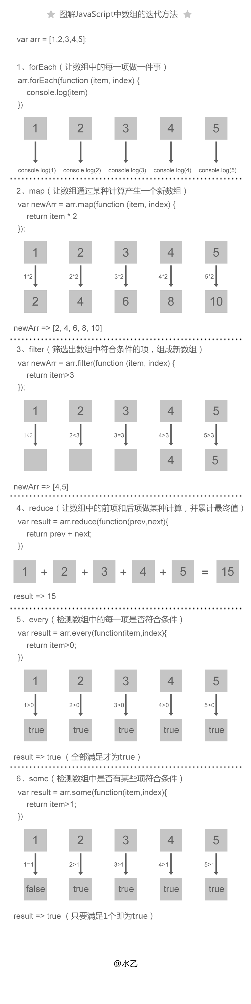 一张图看懂JavaScript中数组的迭代方法:forEach、map、filter、reduce、every、some WangZiWen0201 2018-09-28 194 阅读1分钟 在《JavaScript高级程序设计》中,分门别类介绍了非常多数组方法,其中迭代方法里面有6种,这6种方法在实际项目有着非常广泛的作用。