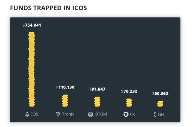 ERC-777标准将解决接收方代币丢失的问题,即当代币被发送至某个不支持接收或无法管理资产的智能合约中时,这些代币也不会丢失。这一问题早已造成以太坊社区丢失了价值数百万美元的代币,其中很大一部分代币似乎被永远困在一些顶级的ICO项目合约中。下图展示了在一些项目的合约中困住的代币价值: