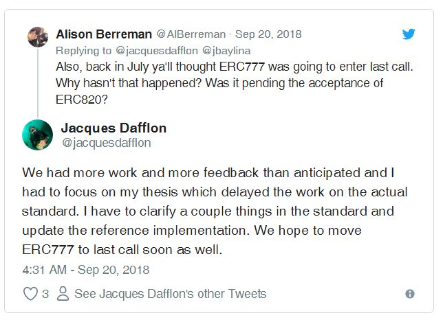 Jacques在推文中表示,由于该团队未预料到工作量和反馈量大的问题,且自己之前专注于ERC-777新标准的论文[3]的撰写。导致延误了该新标准的工作,并希望能尽快完成并发布ERC-777标准。推文内容如下: