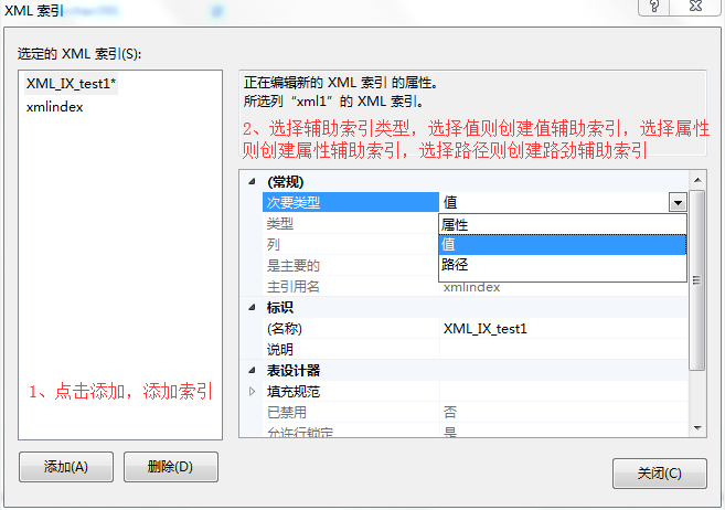 3、在XML索引弹出框-》点击添加,添加索引-》在常规窗口选择次要类型-》选择值则创建XML值辅助索引,选择属性则创建XML属性辅助索引,选择路径则创建XML路径辅助索引。