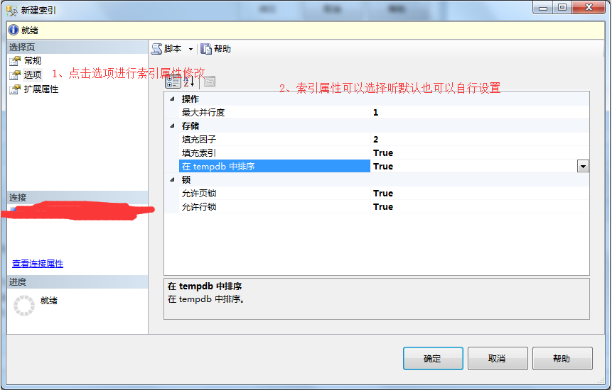3、在新建索引弹出框-》点击选项修改索引属性-》索引属性可以自己设置也可以选择系统默认。