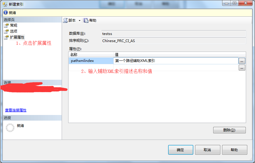 4、在新建索引弹出框-》点击扩展属性-》输入辅助XML索引描述名称和值-》点击确定。
