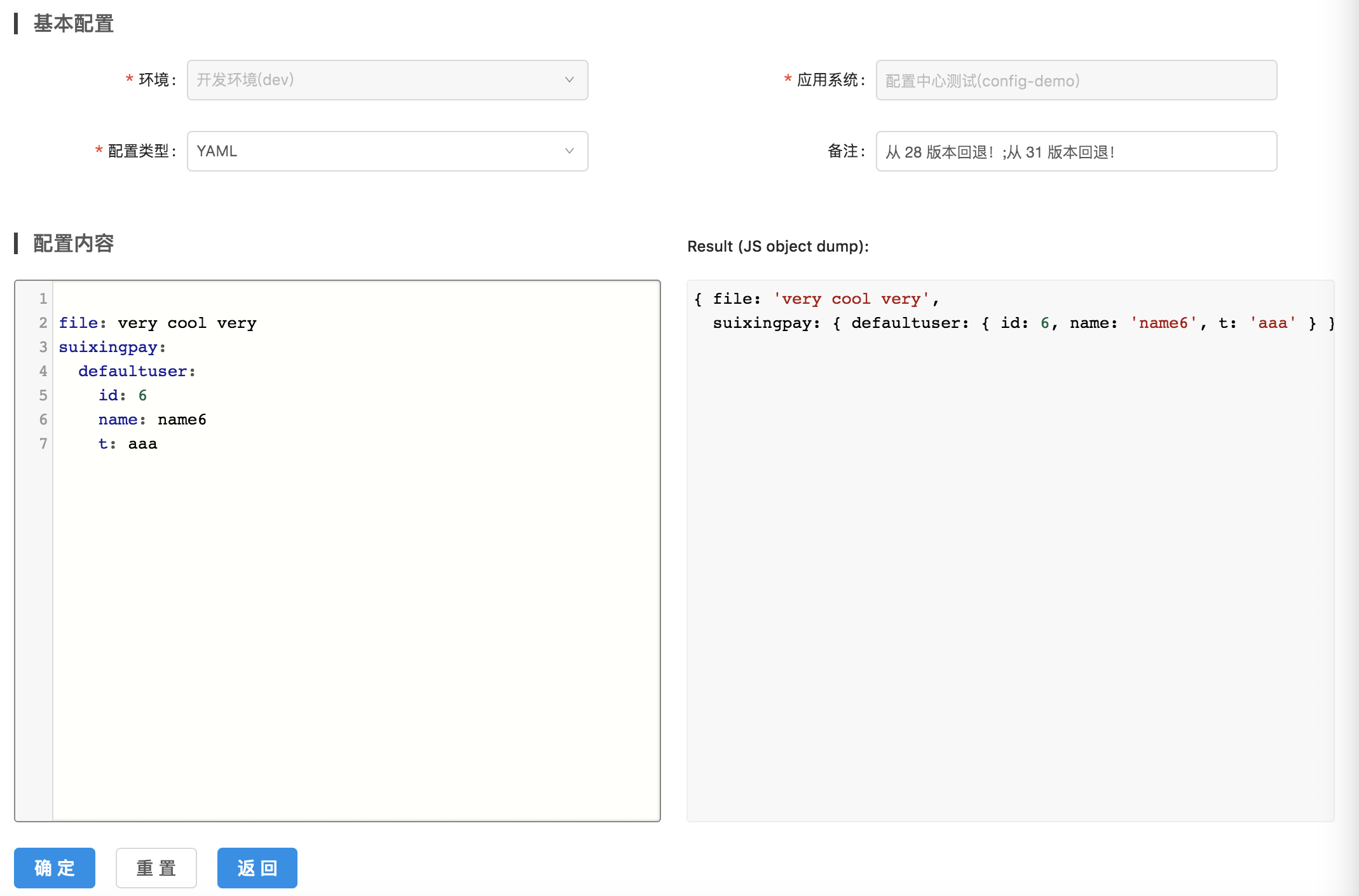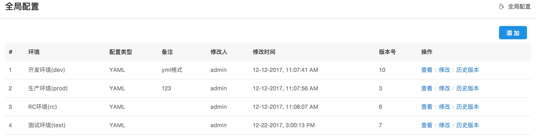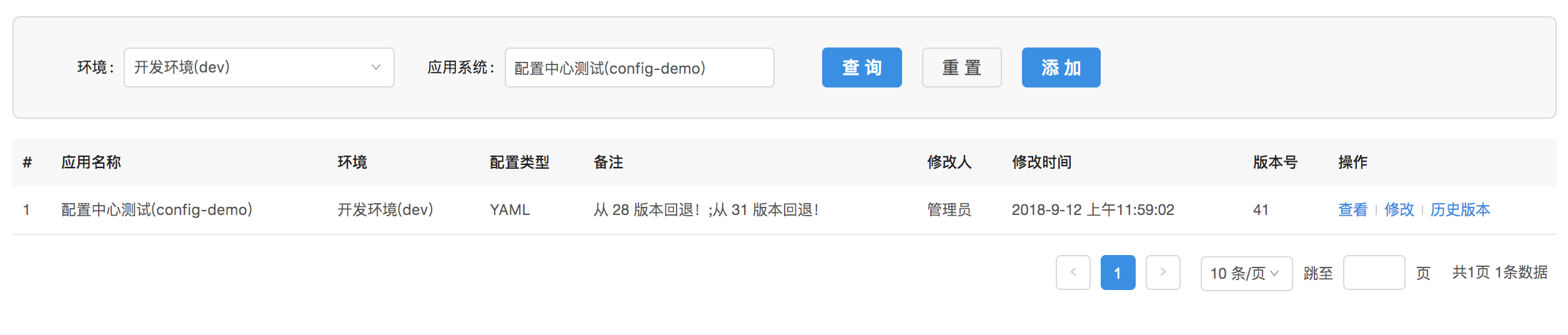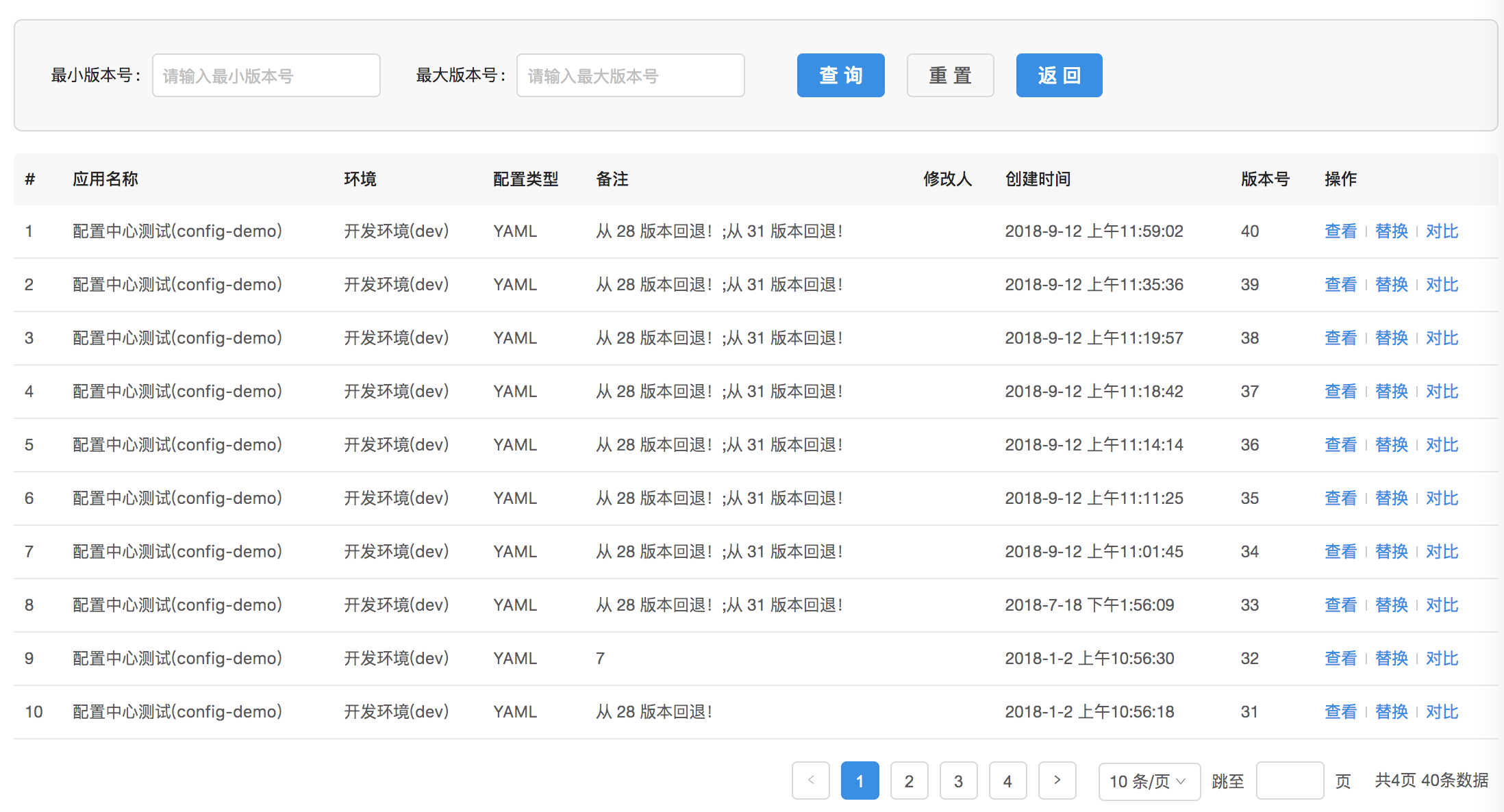 配置内容每修改一次,版本号会自动增加1,同时会将原来配置内容备份到历史表中,以便于查看变更记录和回退。