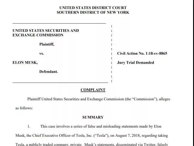 据外媒相关报道称,在最后关头,马斯克的律师电话表示,并没有兴趣继续探讨和解协议的方案。随后,SEC迅速起草了起诉状,向纽约的一家法庭直接起诉马斯克涉嫌证券欺诈。
