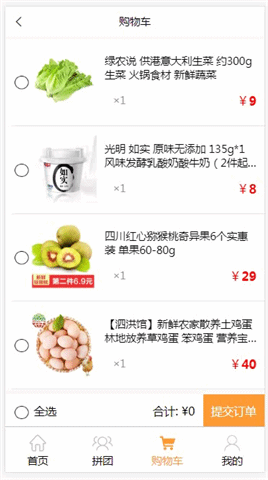 - 选中商品(多选或单选),合计显示选中商品价格