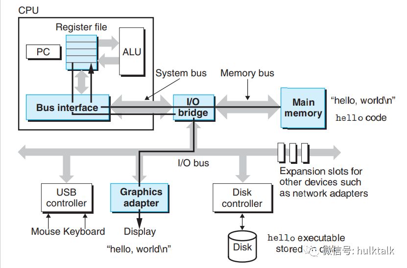 当代码加载到主存后,CPU开始执行程序指令,这些指令拷贝hello, world\n字符串从内存到寄存器,然后传输到显示设备,显示设备负责显示结果: