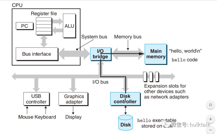 首先,我们通过键盘输入./hello,shell读取每个字符到寄存器中,然后存储到主存中: