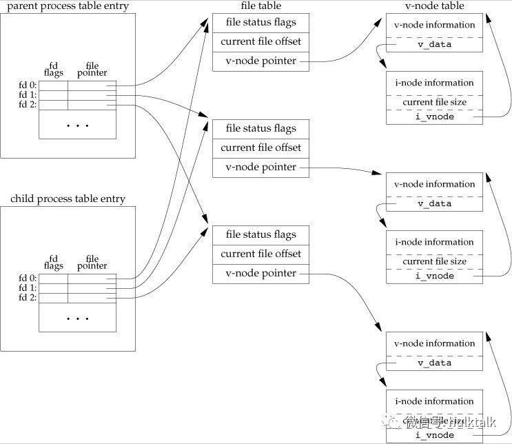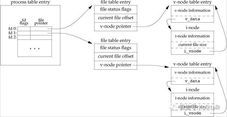 这张图描述的是当我们在程序中用open这个系统调用打开一个文件时,操作系统中维护的相关数据结构,这里最重要的一个说明,就是最左面process table entry部分可以理解为是用户态程序中的,其它的 file table entry和v-node table entry是内核中的。