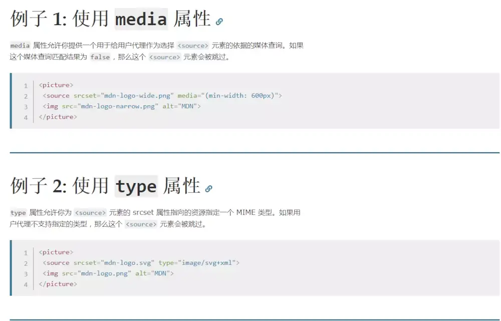 另外HTML5新增的picture标签,对实现响应式图片做了很多扩展。不想敲了,借用MDN说明