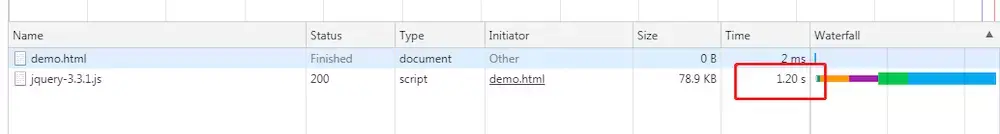 jquery.js脚本文件加载了1.2s的时间,如下图: