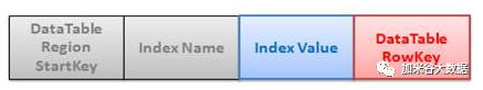 IndexTable的RowKey由四部分组成,按顺序依次是:DataTable Region StartKey、IndexName、IndexValue和DataTable RowKey,如图所示。