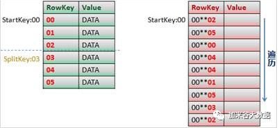 确定SplitKey后,遍历IndexTable Region中所有的行,找出所有DataTable RowKey大于或等于SplitKey的Row,如图所示。