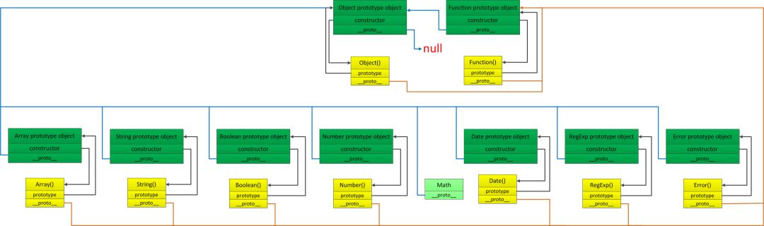 上面的图示中,黄色方框代表built-in函数对象,深绿色方框代表 built-in函数的prototype属性指向的原型对象,名字都叫 xx prototype object,浅绿色方框(即Math对象)代表普通对象,蓝色箭头连接非built-in函数对象(无论是普通对象如Math,还是原型对象)的__proto__属性,而土黄色箭头连接函数对象的