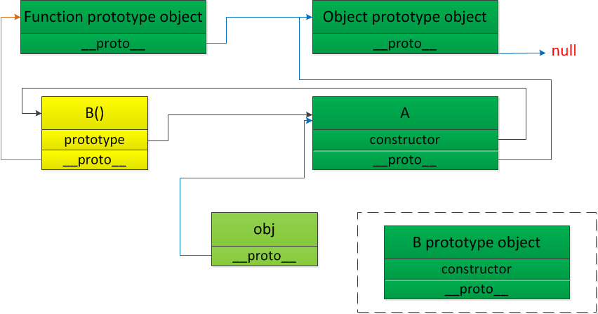 上图中虚线框所包围的B prototype object就是定义函数 B时,JavaScript为函数B生成的原型对象,但是该对象被我们用代码替换成了对象A。由于这个被替换的B prototype object没有其他地方再用到,因此会被回收掉。