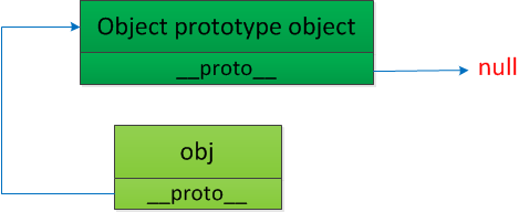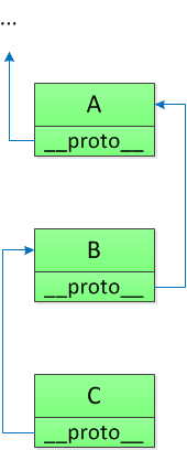 上图中,A,B,C分别代表3个对象,蓝色箭头串接起来的所有对象就构成了对象C的原型链,其中C的_proto__属性指向B,B的 __proto__属性指向A,A的__proto__属性可能指向更高层的对象,也可能指向 null(表示A不继承任何对象的属性和方法)。