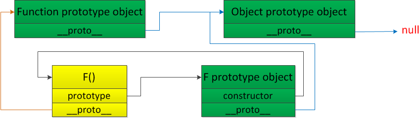 上图中为了方便,没有画出Function prototype object和 Object prototype object的constructor属性。而 F prototype object的 __proto__属性为何指向Object prototype object,下文介绍new操作符时有解释。