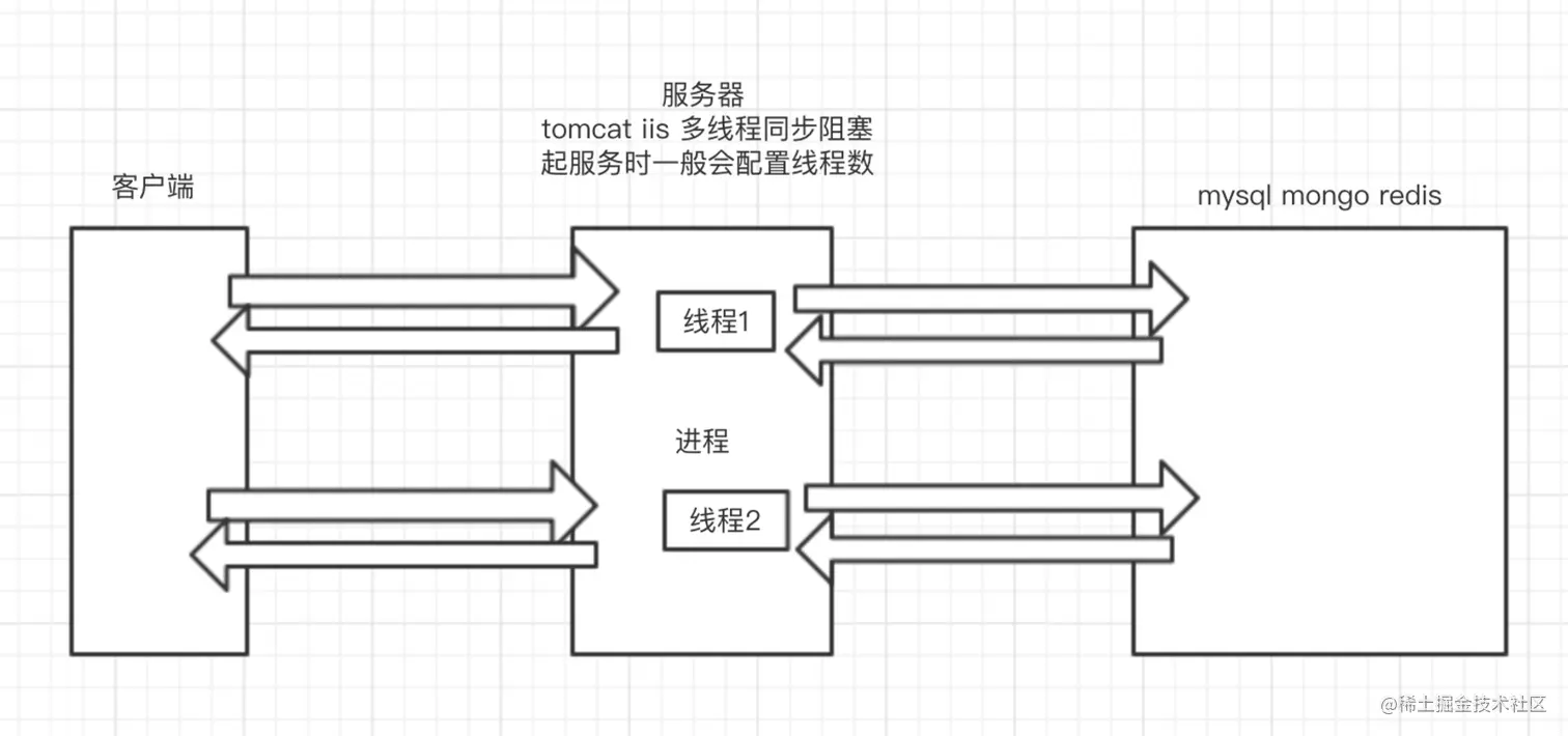 当客户端发起请求到服务器时,服务器会有线程来处理这条请求,假如是tomcat iis等是属于多线程同步阻塞的,在起服务的时候会配置线程数,然后再通过服务器发送请求到数据库请求数据,此时该线程会一直等待数据库的数据返回,当数据库返回数据给服务器后,服务器再把数据返回给客户端。