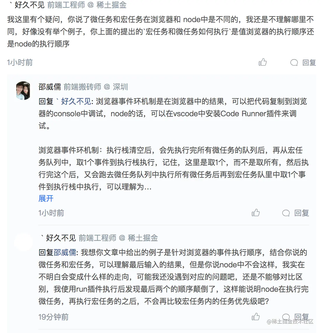在浏览器事件环机制中,当执行栈的同步代码清空后,系统会去读取任务队列,其中会优先读取微任务,把微任务清空后,再依次读取宏任务,这里特别注意,并非一次性执行完所有宏任务,而是像队列那样,先取一个宏任务执行,执行完后,再去看是否有微任务,如果有,则执行微任务,然后再读取一个宏任务执行,不断循环。