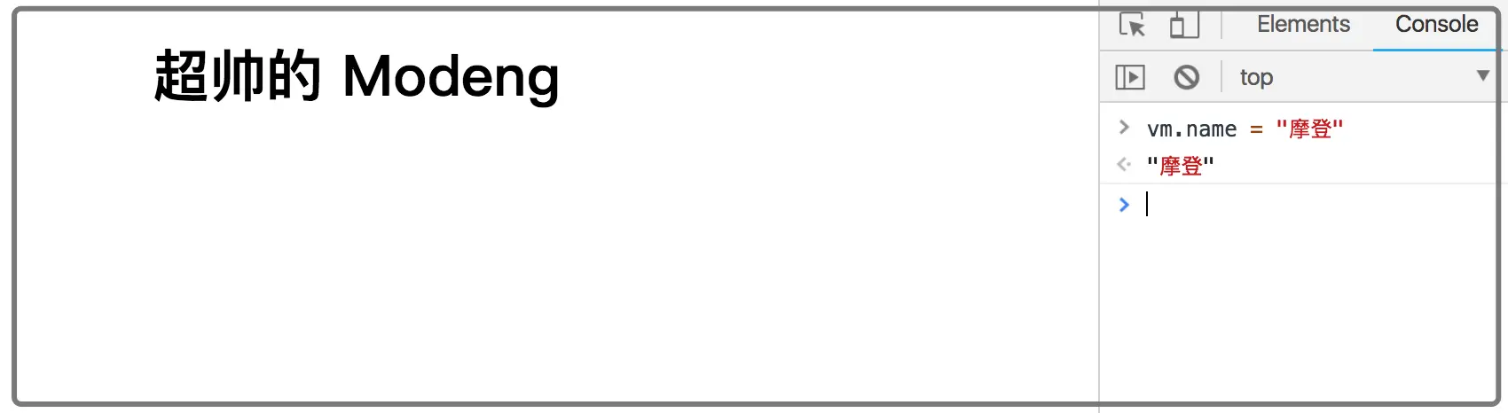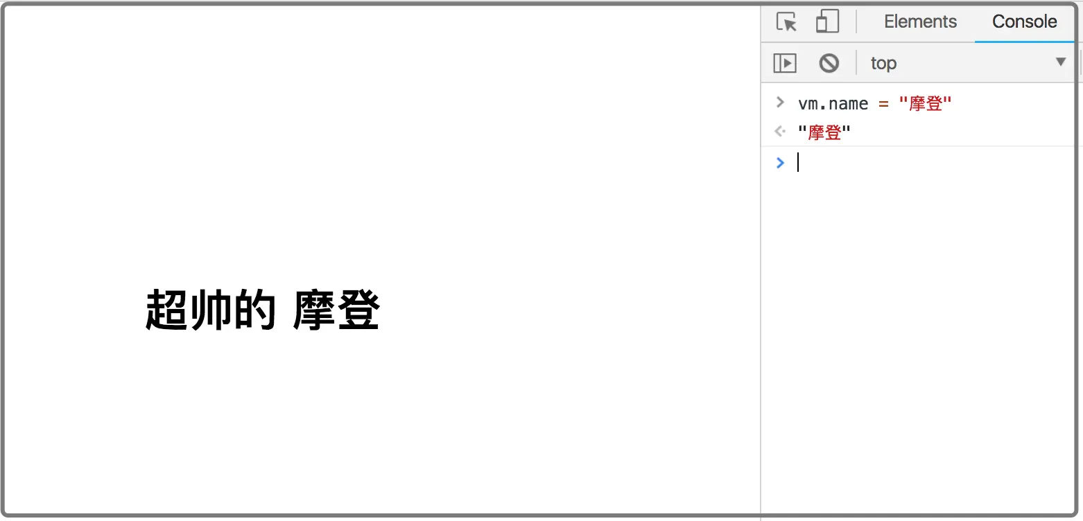 可以看到我们想要的效果显示出来了,在这里我们用到了模版最常见的数据绑定形式 “Mustache”语法 (双大括号) 语法,Mustache 标签将会被数据中相对应的属性替换,并且绑定的对象的属性发生了改变,差值处的内容也会响应的改变。