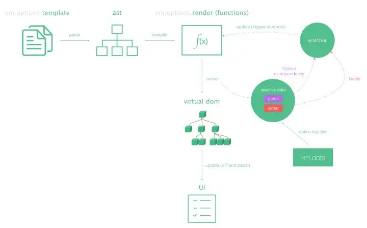 从上面的图中我们看到 Vue 的整个模版的渲染过程,首先我们的模版编译为AST(抽象语法树),再由 AST 生成渲染函数,由渲染函数结合数据生成 Virtual DOM 树,之后对Virtual DOM 进行 diff 和 path之后生成新的 UI