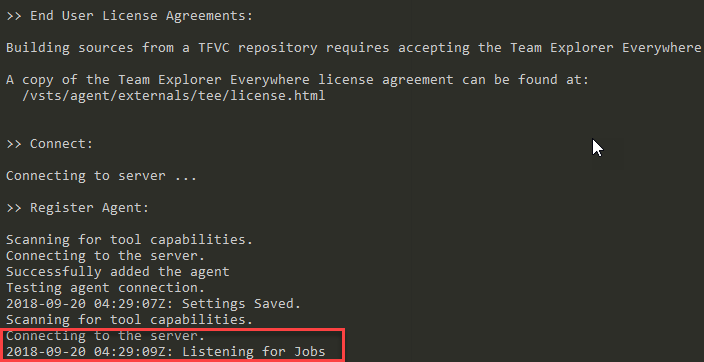 ./bin/Agent.Listener configure --unattended \--agent "${VSTS_AGENT:-$(hostname)}" \--url "$TFS_URL" \--auth Negotiate \--username "$VSTS_User" \--password "$VSTS_PWD" \--pool "${VSTS_POOL:-Default}" \--work "${VSTS_WORK:-_work}" \--replace & wait $!