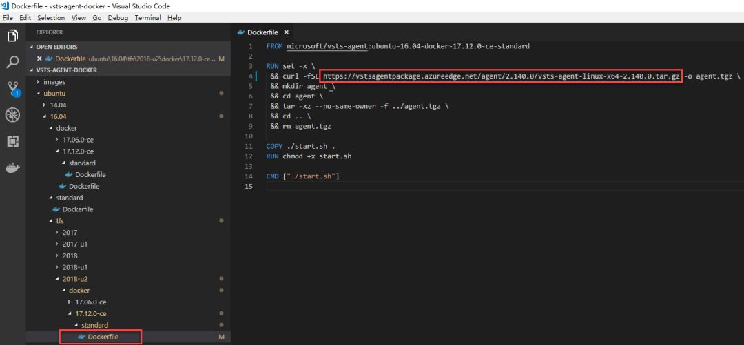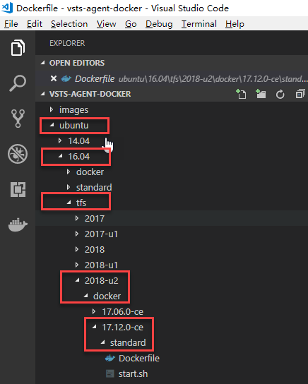 git repo中的目录组织结构和标签是对应的,我们根据标签找到ubuntu-16.04-tfs-2018-u2-docker-17.12.0-ce-standard的Dockerfile