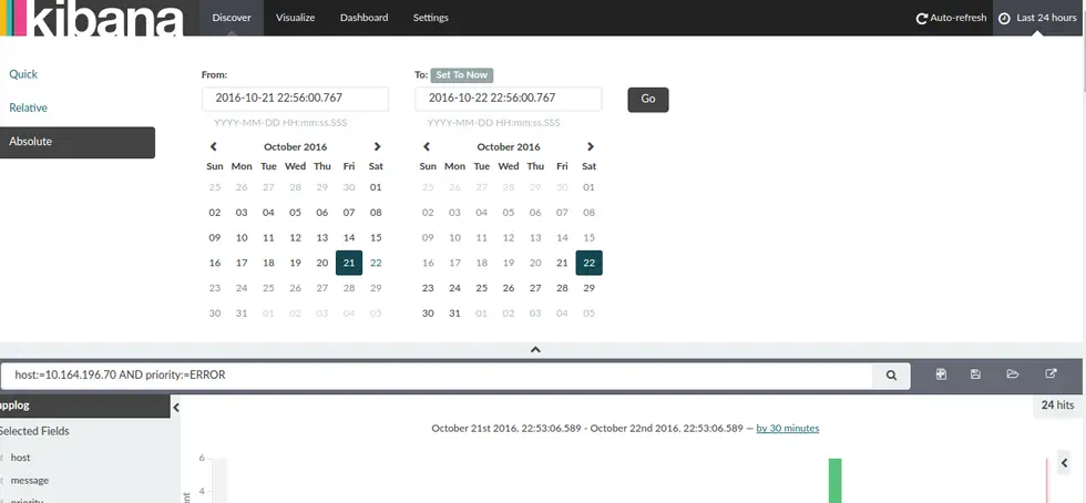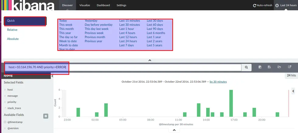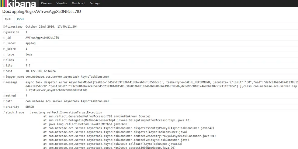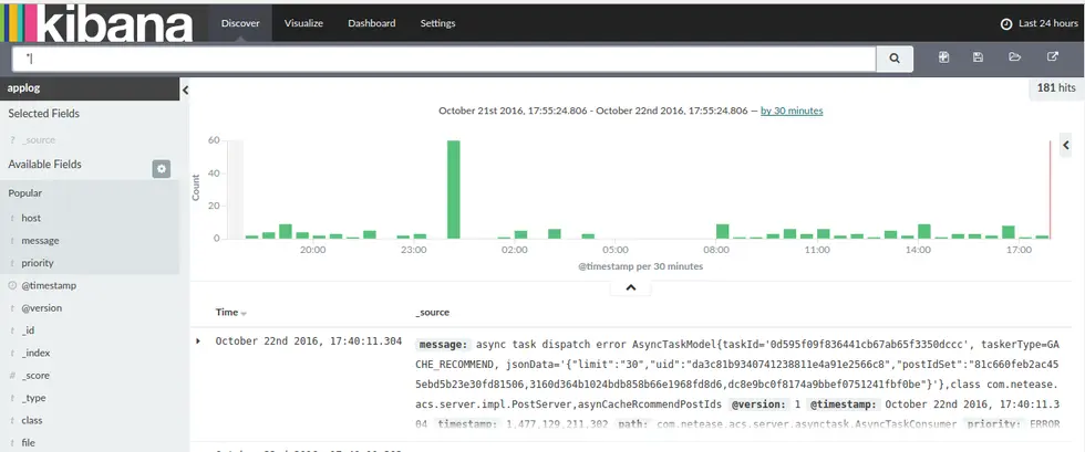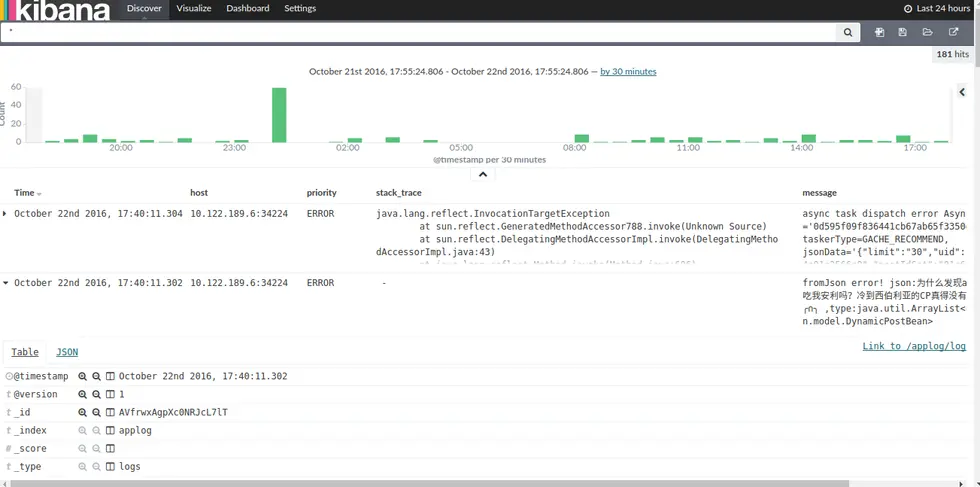 (2)生成24小时内每个时间范围内的异常数量柱状图,点击柱状图下面可以看到具体异常堆栈情况(柱状图统计的是GACHA项目服务器集群过去24小时每个时间段的异常数量,柱状图下面是异常列表,第一张图左侧可以选择添加异常列表展示项,第二张图就是选择了展示host,priority,stack trace,message这些项的结果,第三张图是点击可以看到的具体异常堆栈详情)。
