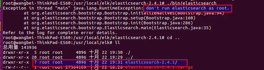 不幸的是报错了,后来在一个国外的论坛上看到ES启动时的用户和组不能和当前目录所属用户和组一致,我比较了一下,果然,我以root用户启动ES,而当前目录所属用户正好是root,找到原因了,那就换个用户启动吧。