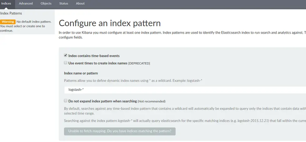 为了后续使用Kibana,需要配置至少一个Index名字或者Pattern,它用于在分析时确定ES中的Index。这里我输入之前配置的Index名字applog,Kibana会自动加载该Index下doc的field,并自动选择合适的field用于图标中的时间字段: