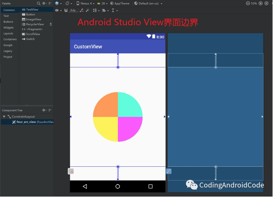 从上图可以看出(开发者选项->打开布局边界),界面上框出了很多大小不一的矩形框,我们可以把这里的每一个框都看作一个View或一个View子孙类,在Android Studio中打开布局管理器,也能看到类似于这种效果,如图-Android Studio View界面边界。
