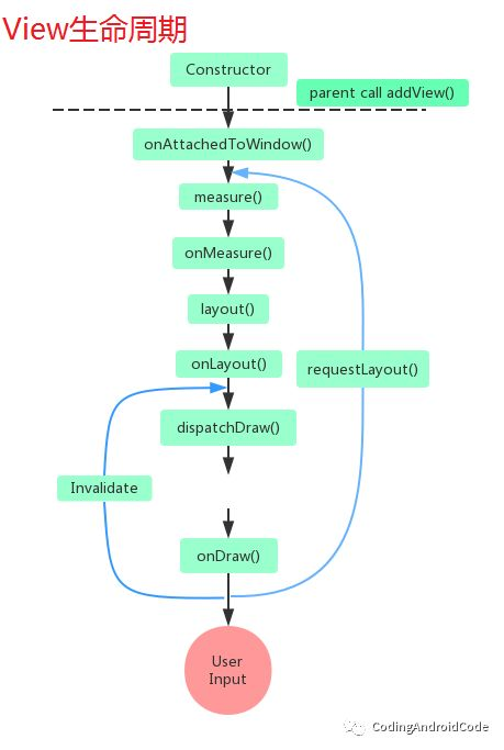invalidate()的同作用函数postInvalidate(),两者均用于更新View内容,只不过postInvalidate()发生在单独的线程,invalidate()发生在主线程;View整个生命周期中有四个重要函数,构造器从XML文件中解析View属性,onMeasure()测量View大小,测量过程与测量模式,Padding,Margin等有关,onLayout()完成View的位置布局,onDraw()完成View内容的绘制;如上图所示,如果需要