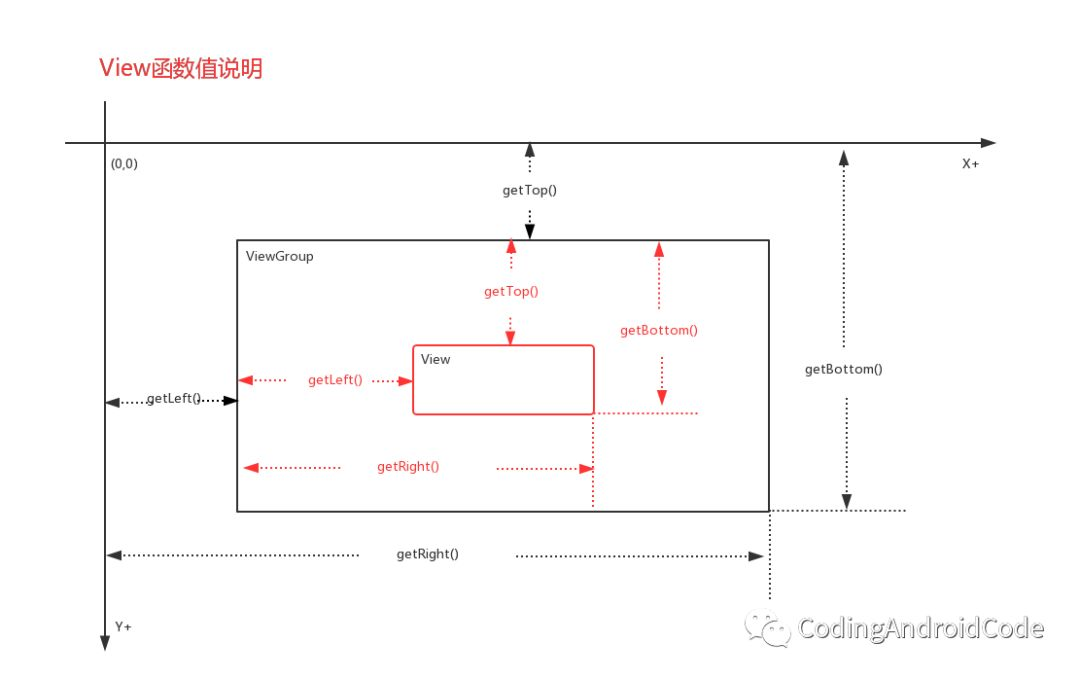 如图-View坐标系所示,View内部的坐标原点位于View所在矩形的左上角,以屏幕水平右方向为X轴正向,以垂直向下方向为Y轴正向,那么我们经常使用的View#getTop(),View#getLeft(),View#getBottom(),View#getRight()等返回的又是哪里的距离呢?