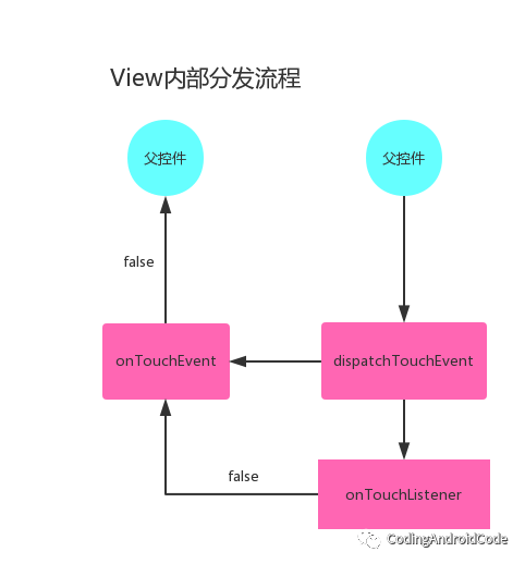 从图-View内部分发机制 ,在View内部事件分发过程中,事件起始于父控件调用dispatchTouchEvent,止于onTouchListener或者onTouchEvent返回true(true-事件被消耗,false-未消耗事件),如果onTouchListener返回false或为空,事件会进一步传递到onTouchEvent处理,如果onTouchEvent返回false,事件会被扔回父控件处理,如果每级都按照上述流程返回false,则事件会被上传到操作系统抛弃掉。