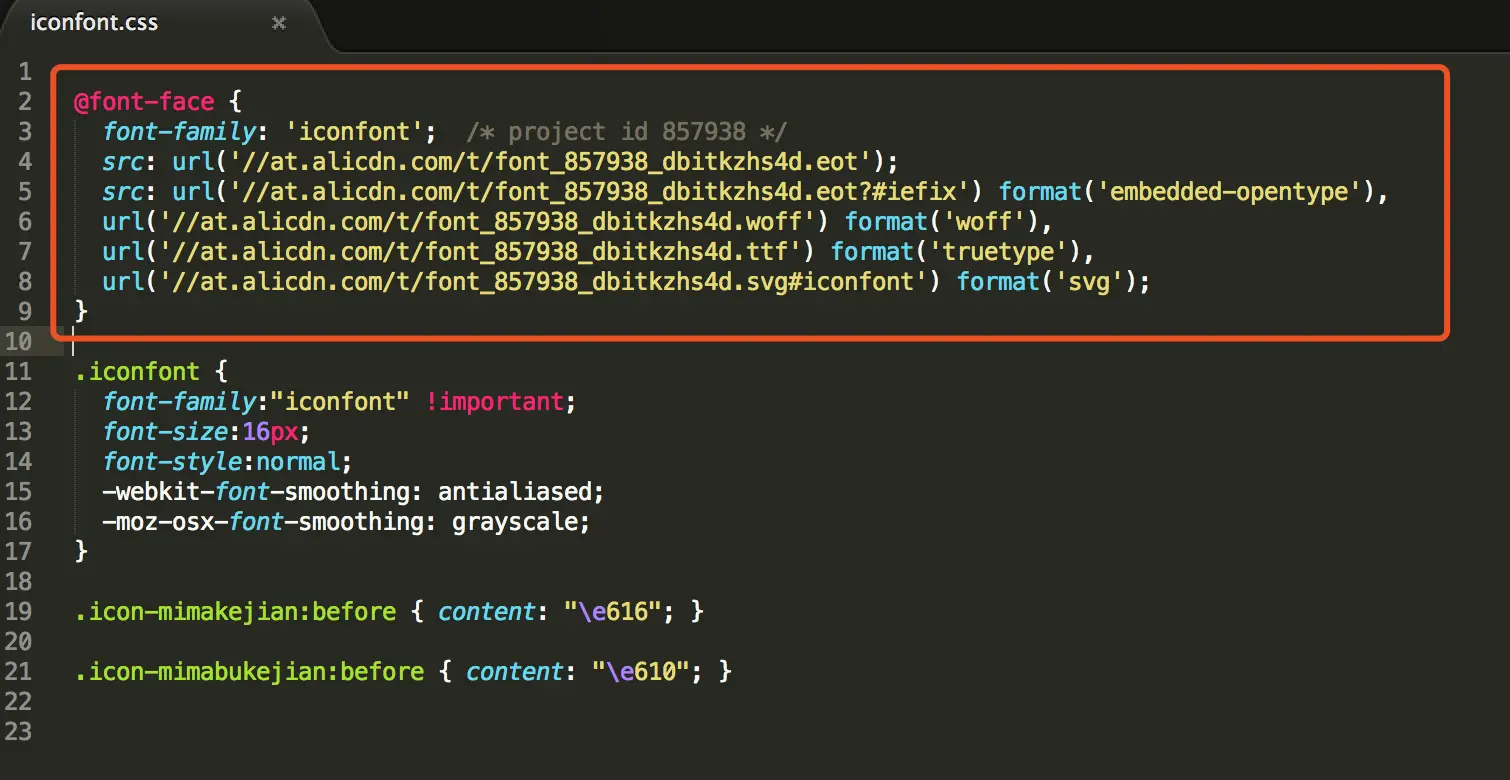 6.将iconfont.css整个代码进行复制,黏贴至微信小程序中app.css中
