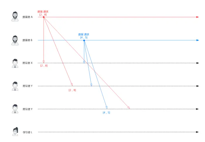 下图演示了两个 Proposer(提案者) 和三个 Acceptor(附议者) 的系统中运行该算法的初始过程,每个 Proposer 都会向所有 Acceptor 发送提议请求。